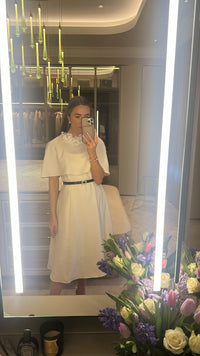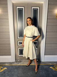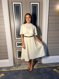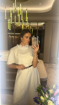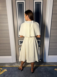 A graceful all-cream dress featuring a removable cape with delicate floral detailing at the neckline. Effortlessly elegant, with or without the cape.